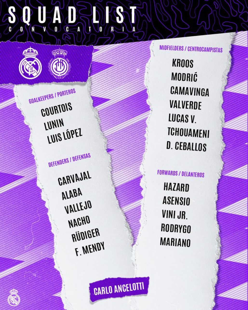 وشهدت القائمة غياب كريم بنزيما هداف وقائد الفريق الأول لكرة القدم بنادي ريال مدريد؛ للإصابة التي تعرض لها مؤخرًا، وكذلك عدم تواجد البرازيلي إيدير ميليتاو مدافع الفريق، والظهير الأيمن ألفارو ألفارو أودريوزولا.