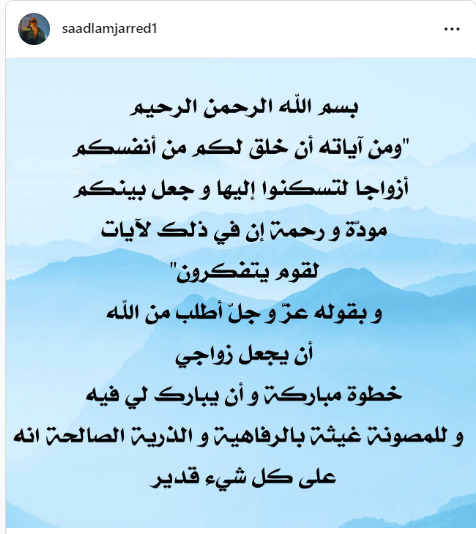 وكتب سعد لمجرد عبر حسابه الشخصي على انستجرام: بسم الله الرحمن الرحيم "ومن آياته أن خلق لكم من أنفسكم أزواجًا لتسكنوا إليها وجعل بينكم مودة ورحمة إن في ذلك لآيات لقوم يتفكرون"، وبقوله عز وجل أطل من الله أن يجعل زواجي خطوة مباركة وأن يبارك لي فيه وللمصونة غيثة بالرفاهية والذرية الصالح وإنه على كل شيء قدير.