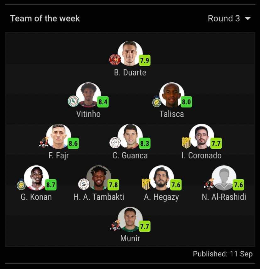 ونشرت شبكة سوفا سكور العالمية، تشكيل الجولة الثالثة لأفضل 11 لاعبًا في الدوري السعودي للمحترفين عقب نهاية كافة مباريات الجولة.
