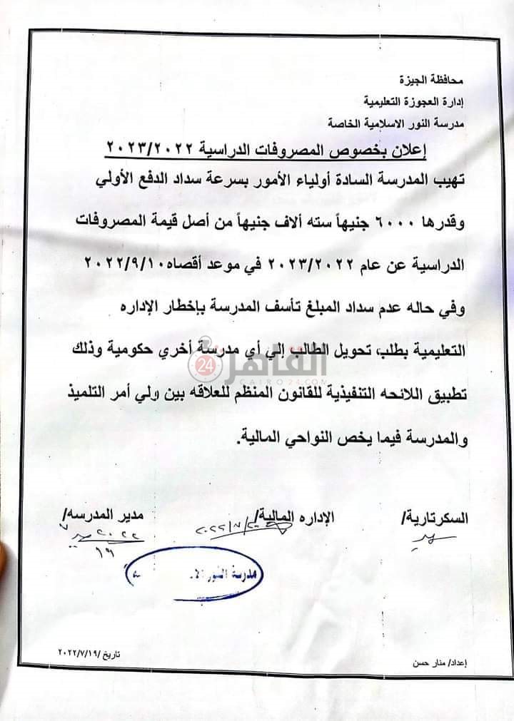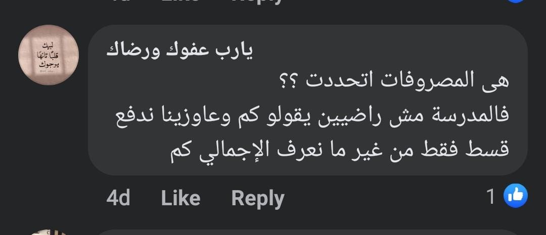 بينما قالت أميرة مرسي ولية أمر، إنه تم تحصيل المصروفات قبل إعلان القرار بتقسيط مصروفات المدارس على 3 أقساط، مؤكدة أن المدرسة نشرت مستند يتضمن بداخله أنه حال عدم سداد المبلغ تأسف المدرسة بإخطار الإدارة التعلمية بطلب تحويل الطالب إلى أي مدرسة أخرى حكومية وذلك لتطبيق اللائحة التنفيذية للقانون المنظم للعلاقة بين ولي أمر التلميذ والمدرسة فيما يخص النواحي المالية، لافتة إلى أن آخر موعد لسداد المصروفات كان أمس 10 سبتمبر.