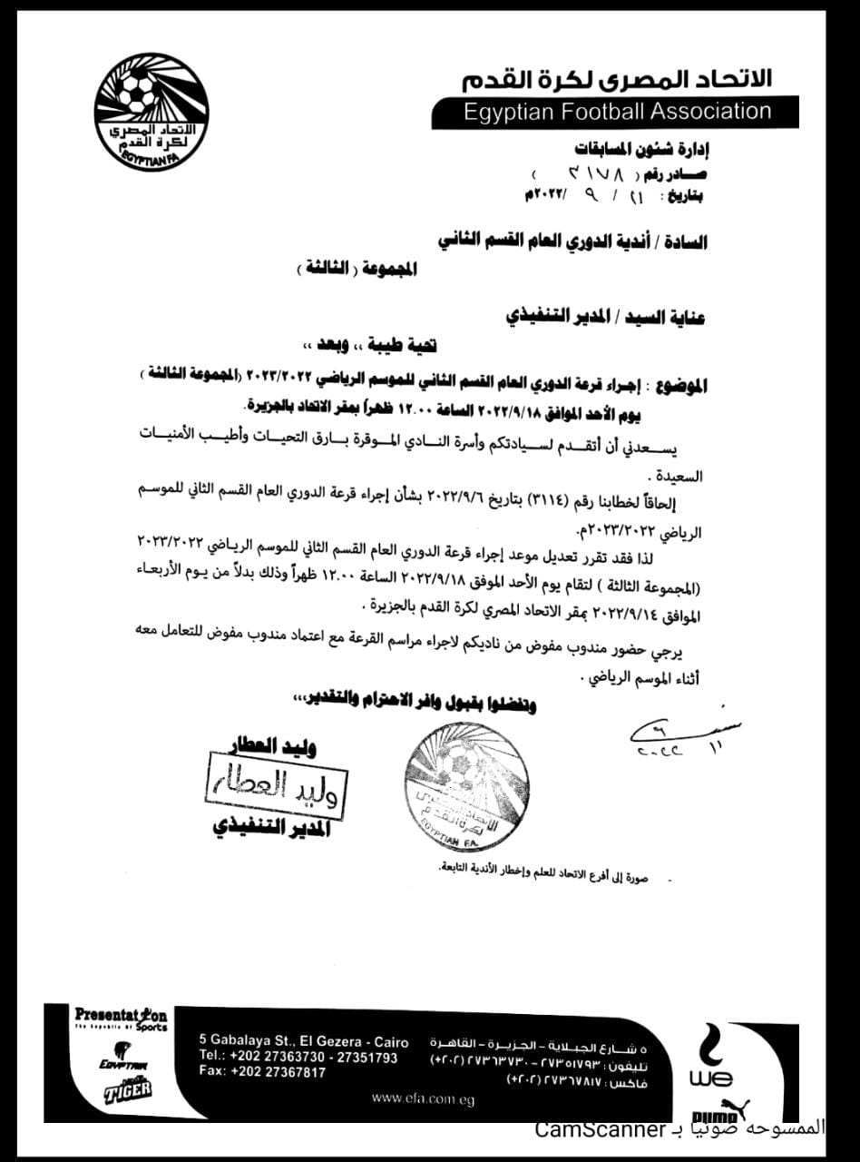 أرسل الاتحاد المصري لكرة القدم، إلى أندية المجموعة الثالثة بحري بـ دوري الدرجة الثانية المشاركة في الموسم الجديد من المسابقة، خطابًا، بتعديل موعد إجراء قرعة الموسم الجديد.