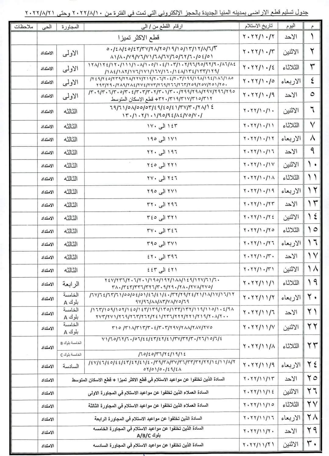ويبدأ الجهاز تسليم الأراضي يبدأ يوم الأحد 2 -10 -2022 وتستمر حتى الإثنين 21 -11-2022.