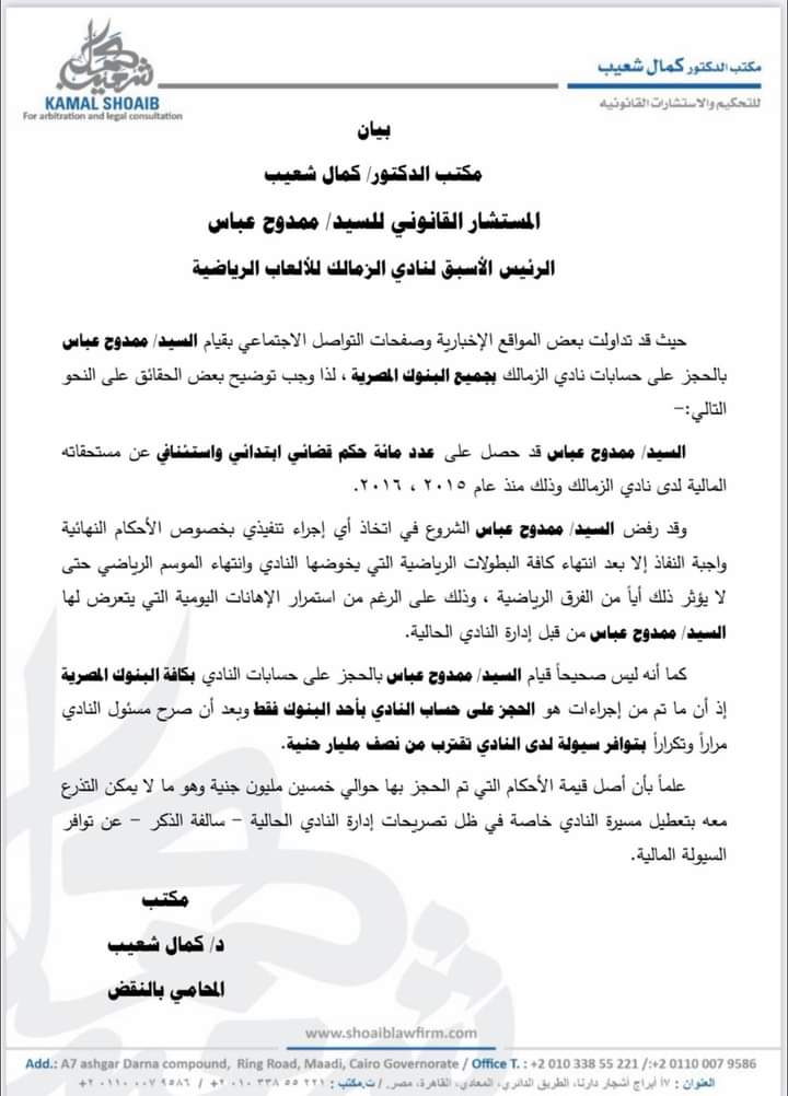 أصدر كمال شعيب محامي، ممدوح عباس رئيس الزمالك الأسبق، بيانا حول حقيقة الحجز على أرصدة نادي الزمالك في البنوك المصرية من جانب موكله ممدوح عباس.