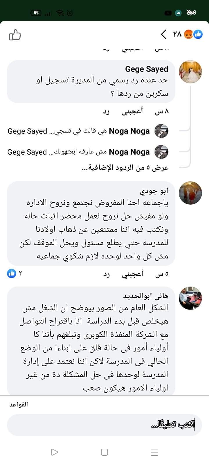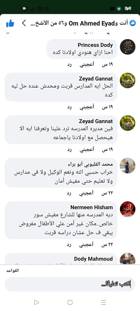 وكتبت نرمين هاشم، عبر جروب المدرسة: لابد أن تجد المدرسة حلا آمنا لأولادنا وتوفير مكان مخصص للدراسة بديل أو سرعة الانتهاء من أعمال البناء قبل بدء العام الدراسي الجديد المقرر في أكتوبر المقبل.