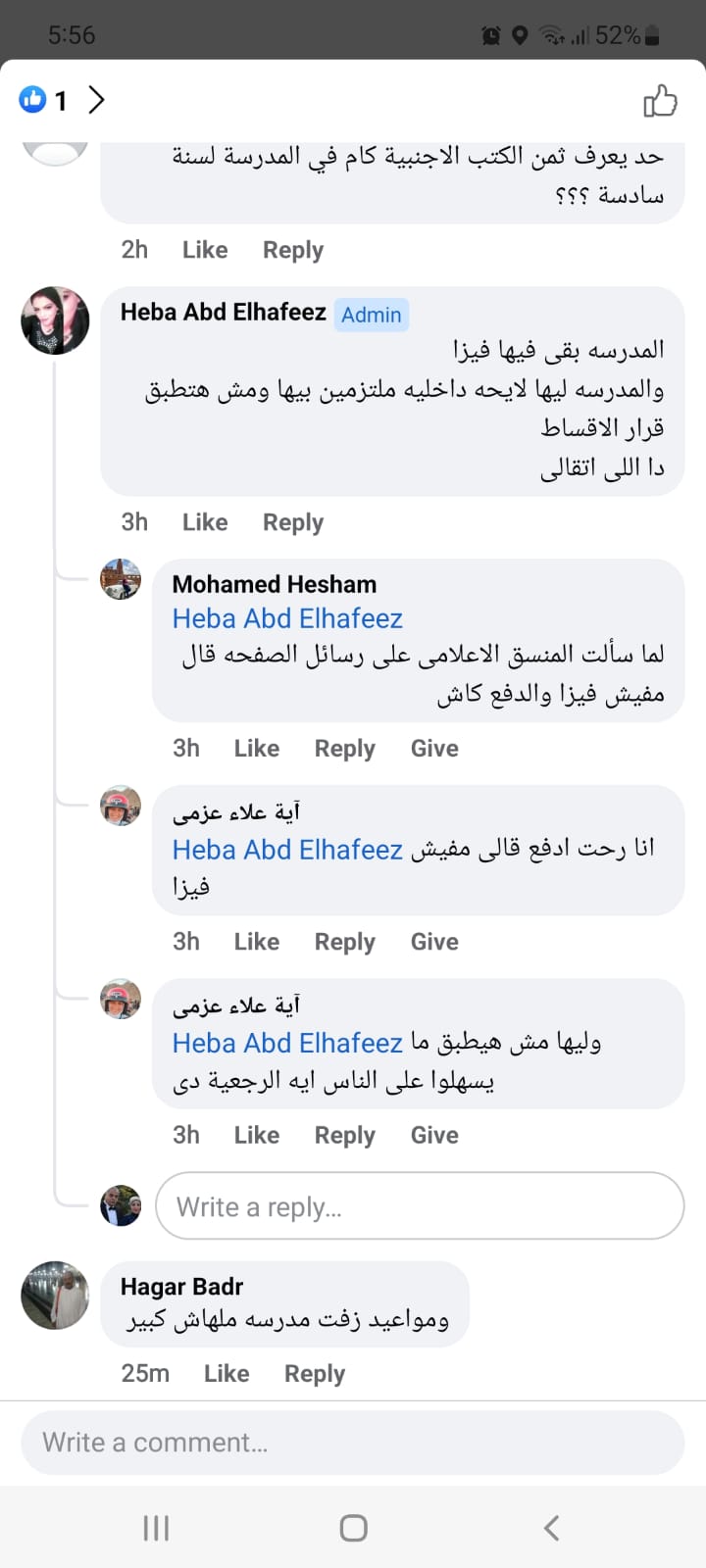 وكتبت روز يونس، ولية أمر، إحنا مش فاهمين يعني إيه لها لائحة داخلية تمنع التقسيط، مطالبة إدارة المدرسة بتوضيح المصروفات الدراسية بشكل مفصل بما يعني عايزين ورقة المصروفات مفصلة فيها تمن الكتب اللغات تمن كتب الوزارة الأنشطة كل التفاصيل مش ورقة نازلة بالمصروفات بس.