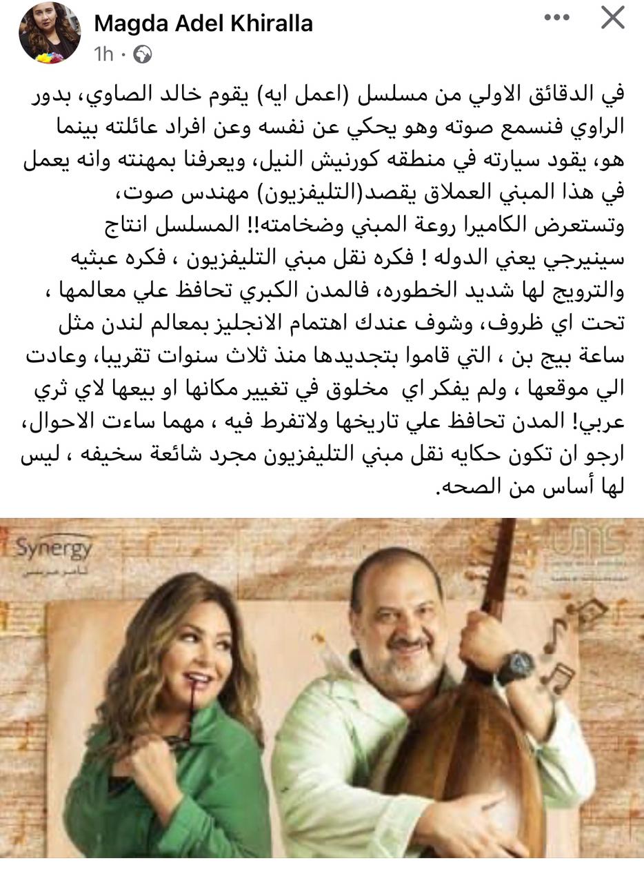 وكتبت ماجدة خير الله عبر حسابها على فيسبوك: في الدقائق الأولى من مسلسل أعمل إيه يقوم خالد الصاوي، بدور الراوي فنسمع صوته وهو يحكي عن نفسه وعن أفراد عائلته، بينما هو يقود سيارته في منطقة كورنيش النيل، ويعرفنا بمهنته وأنه يعمل في هذا المبني العملاق يقصد ماسبيرو (مبنى التليفزيون) كـ مهندس صوت.
