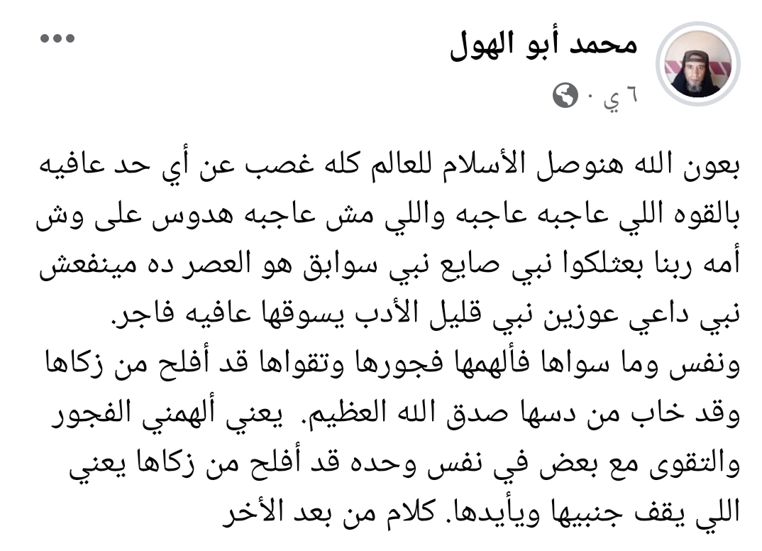 تعود الواقعة إلى السبت الماضي، حين رصد القاهرة 24 حالة من الغضب لدى رواد مواقع التواصل الاجتماعي فيسبوك، بسبب منشورات ادعى خلالها المتهم سالف الذكر أنه خاتم الأنبياء والمهدى المنتظر.
