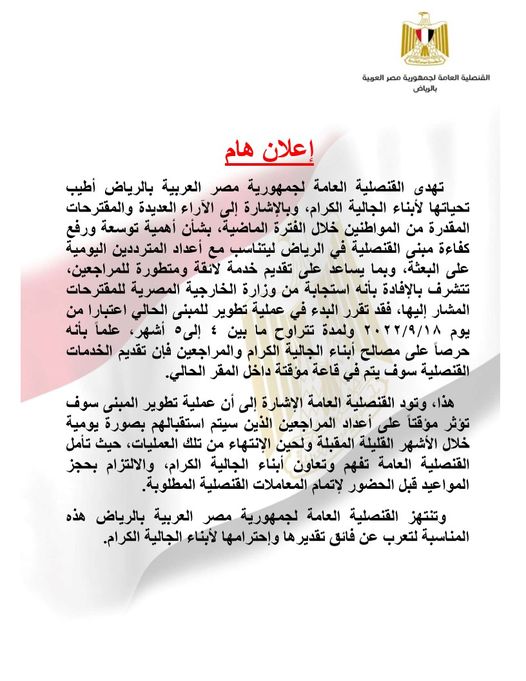 أعلنت القنصلية المصرية العامة بالعاصمة السعودية الرياض، البدء في عملية تطوير المبنى الحالي للقنصلية بداية من الأحد المقبل 18 سبتمبر الجاري، لمدة تتراوح ما بين 4 إلى 5 أشهر.