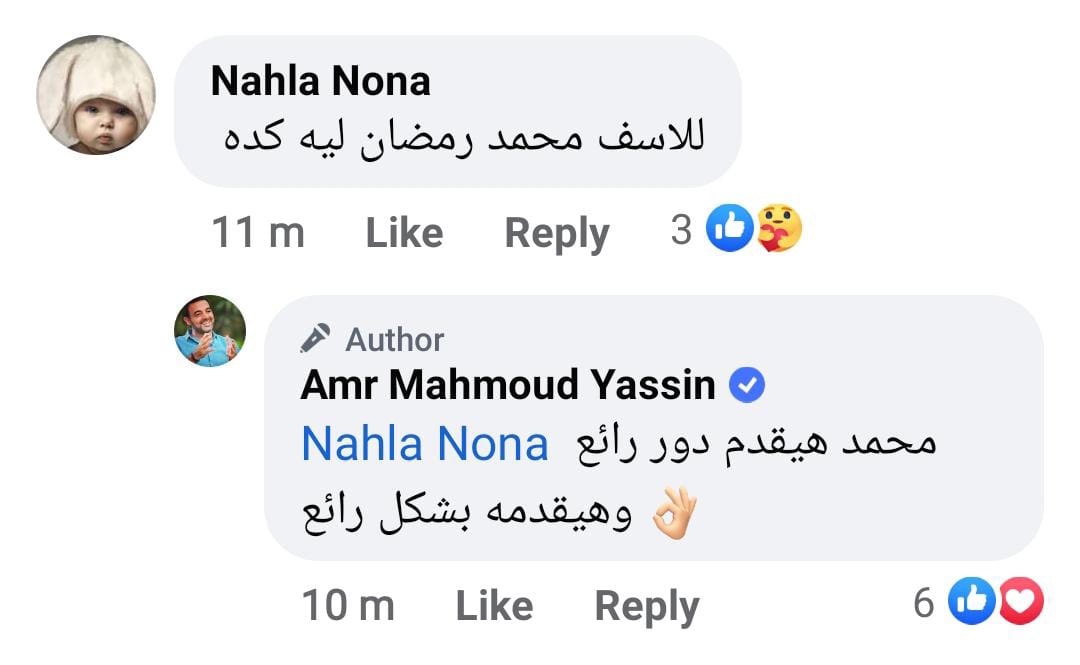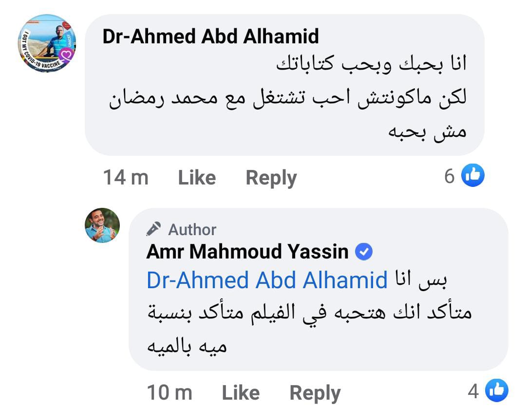 وجاء تعليق آخر، قائلًا: أنا بحبك وبحب كتابتك لكن ماكونتش أحب تشتغل مع محمد رمضان مش بحبه،.. ورد عليه عمرو ياسين قائلًا: بس أنا متأكد إنك هتحبه في الفيلم متأكد بنسبة 100%.