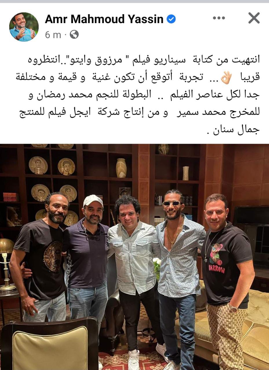 ونشر عمرو محمود ياسين، صورة جمعته بفريق عمل فيلم مرزوق وإيتو، وذلك عبر حسابه الشخصي بموقع فيسبوك، وعلق قائلًا: انتهيت من كتابة سيناريو فيلم مرزوق وإيتو.. انتظروه قريبًا.. تجربة أتوقع تكون غنية وقيمة ومختلفة لكل جدًا عناصر الفيلم.. البطولة للنجم محمد رمضان وللمخرج محمد سمير، وإنتاج شركة ايجل فيلم للمنتج جمال سنان.