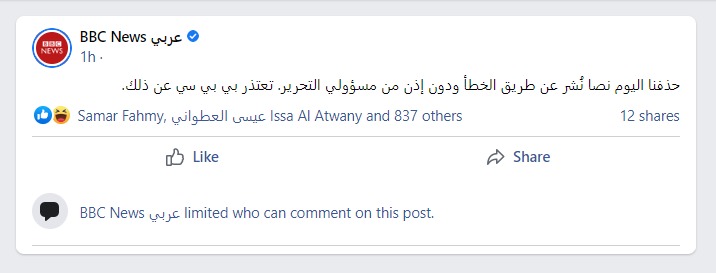 ونشرت صفحة BBC منشورا قالت فيه: حذفنا اليوم نصا نُشر عن طريق الخطأ ودون إذن من مسؤولي التحرير. تعتذر بي بي سي عن ذلك.