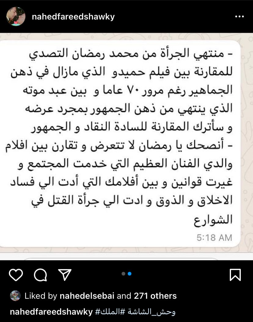 وتابعت ناهد فريد شوقي: أنصحك يا رمضان لا تتعرض وتقارن بين أفلام والدي الفنان العظيم التي خدمت المجتمع وغيرت القوانين، وبين أفلامك التي أدت إلى فساد الأخلاق والذوق وأدت إلى جراءة القتل في الشوارع.