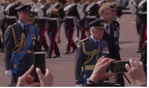 فيما ارتدى الملك تشارلز والأمير ويليام الزي العسكري الكامل، وسار ويليام خلف الملك وسار الأمير أندرو بجانب تشارلز، فيما ظل الأمير هاري في الخلف.
