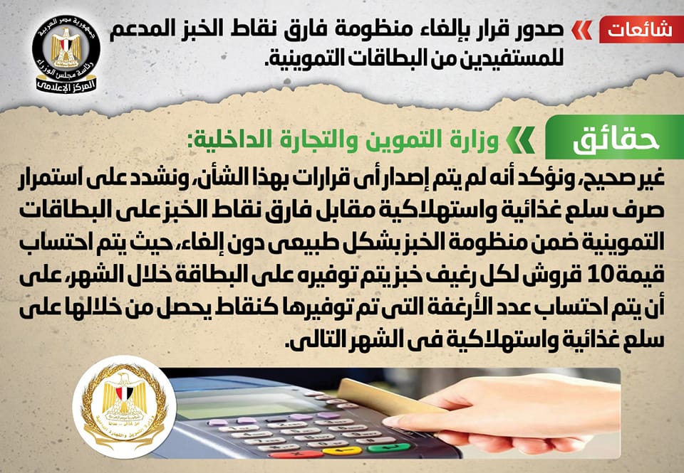 وتواصل المركز الإعلامي لمجلس الوزراء مع وزارة التموين والتجارة الداخلية، والتي أكدت أنه لا صحة لإلغاء منظومة فارق نقاط الخبز المدعم للمستفيدين من البطاقات التموينية، وأنه لم يتم إصدار أي قرارات بهذا الشأن، مُشددة على استمرار صرف سلع غذائية واستهلاكية مقابل فارق نقاط الخبز على البطاقات التموينية ضمن منظومة الخبز بشكل طبيعي دون إلغاء، حيث يتم احتساب قيمة 10 قروش لكل رغيف خبز يتم توفيره على البطاقة خلال الشهر، على أن يتم احتساب عدد الأرغفة التي تم توفيرها كنقاط يحصل من خلالها على سلع غذائية واستهلاكية في الشهر التالي.