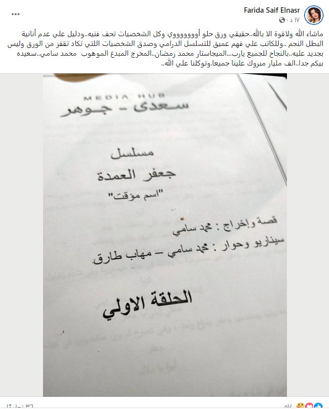 ونشرت الفنانة فريدة سيف النصر صورة لسيناريو العمل، وذلك من خلال حسابها الشخصي بموقع التواصل الاجتماعي فيس بوك، حيث قالت: ما شاء الله ولاقوة إلا بالله.. حقيقي ورق حلو أوي وكل الشخصيات تحف فنية.