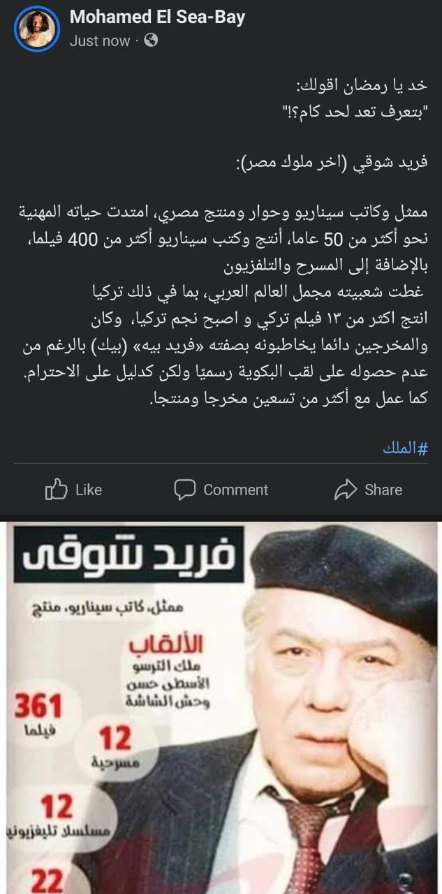وكتب محمد السباعي عبر حسابه على موقع فيسبوك: خد يا رمضان أقولك.. بتعرف تعد لحد كام؟ فريد شوقي أخر ملوك مصر وممثل وكاتب سيناريو وحوار ومنتج مصري.. امتدت حياته المهنية نحو أكثر من 50 عاما، أنتج وكتب سيناريو أكثر من 400 فيلما، بالإضافة إلى المسرح والتلفزيون.. وغطت شعبيته مجمل العالم العربي.