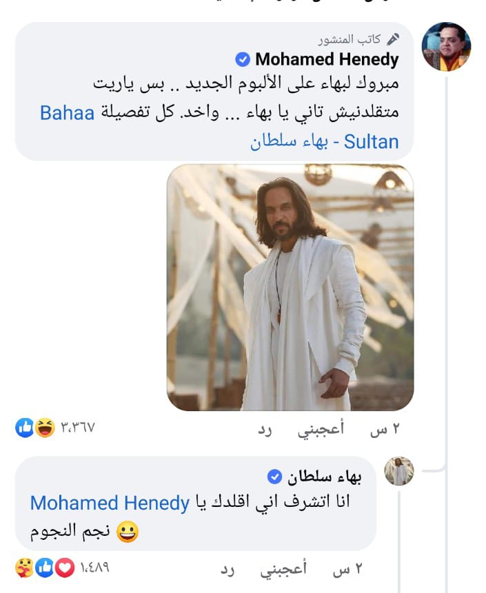 وعلق بهاء سلطان، على الصورة التي نشرها هنيدي مشبهًا فيها نفسه بـ السلطان ويطلب منه عدم تقليده مرة أخرى، في رسالة طريفة بينهما، ليرد عليه بهاء سلطان، قائلًا: أنا أتشرف إني أقلدك يا نجم النجوم.