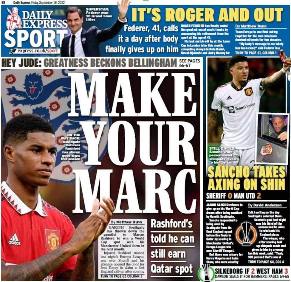قالت ديلي إكسبريس في غلافها إن ماركوس راشفورد لاعب مانشستر يونايتد الإنجليزي، يقترب من المشاركة في مونديال قطر، مع منتخب إنجلترا رغم إصابته الأخيرة.