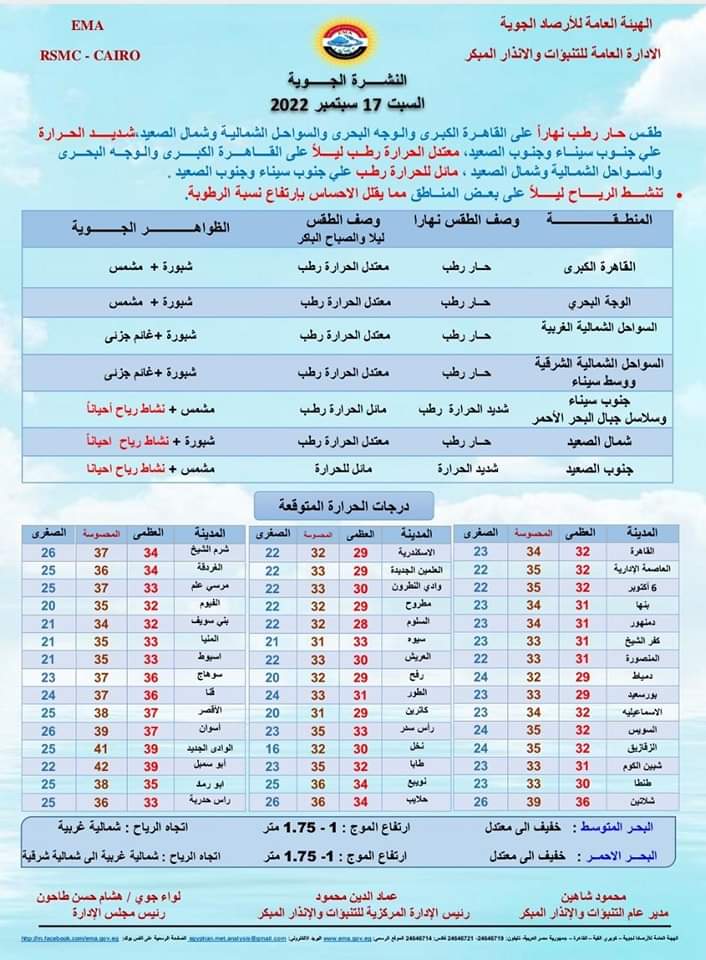 قالت الهيئة العامة للأرصاد الجوية، إنه يسود المدن المصرية، غدًا السبت، الموافق 17 سبتمبر لعام 2022، طقس حار رطب نهارًا على القاهرة الكبرى والوجه البحري والسواحل الشمالية وأيضًا شمال الصعيد، شديد الحرارة على جنوب سيناء وجنوب الصعيد.