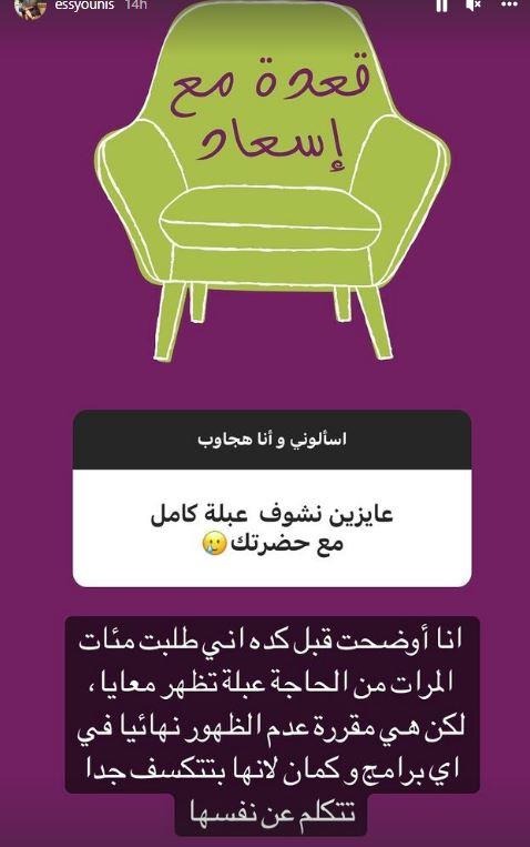 وردت إسعاد يونس على أحد السائلين، وذلك عبر خاصية استوري على حسابها الرسمي بـ انستجرام، وجاء سؤال أحد الأشخاص: عايزين نشوف عبلة كامل مع حضرتك وردت إسعاد يونس: أنا وضحت قبل كدة إني طلبت مئات المرات من الحاجة عبلة تظهر معايا، ولكن هي مقررة عدم الظهور نهائيًا في أي برامج، وكمان لأنها بتتكسف تتكلم عن نفسها.