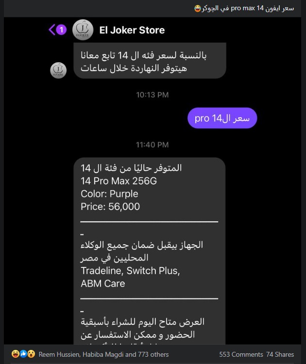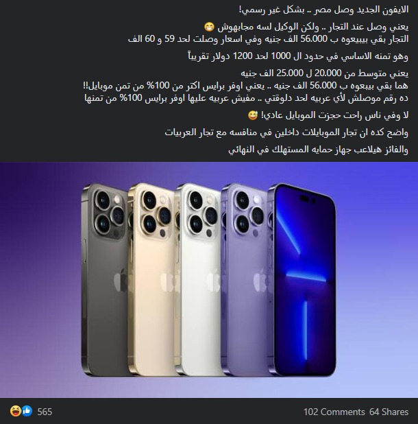 تصدر وسم سعر آيفون الجديد آيفون 14، تريند موقع التواصل الاجتماعي فيسبوك، بعد توفره في بعض المحال بأسعار خيالية بحسب تجار، ذكروا أنها تخطت سعره الأصلي بزيادة نحو 100%.