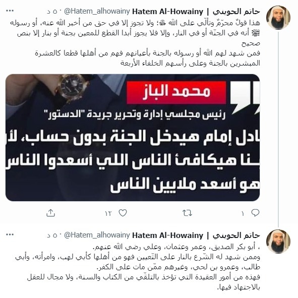 وكتب حاتم الحويني، عبر حسابه على موقع التواصل الاجتماعي فيس بوك: هذا قول محرم وتألّي على الله؛ ولا تجوز إلا في حق من أخبر الله عنه، أو رسوله صلى الله عليه وسلم، أنه في الجنّة أو في النار، وإلّا فلا يجوز أبدًا القطع للمعين بجنة أو بنار إلا بنصٍ صحيح.