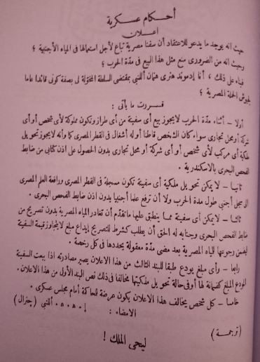 وجاء في الإعلان: حيث إنه يوجد ما يدعو لاعتقاد أن سفنا مصرية تُباع لأجل استعمالها في المياه الأجنبية؛ وحيث إنه من الضروري منع مثل هذا البيع في مدة الحرب؛ فبناء على ذلك، أنا إدموند هنری هنمان أللنبي بمقتضى السلطة المخولة لي بصفة کوني قائدا عاما لجيوش الحملة المصرية، قررت ما يأتی: