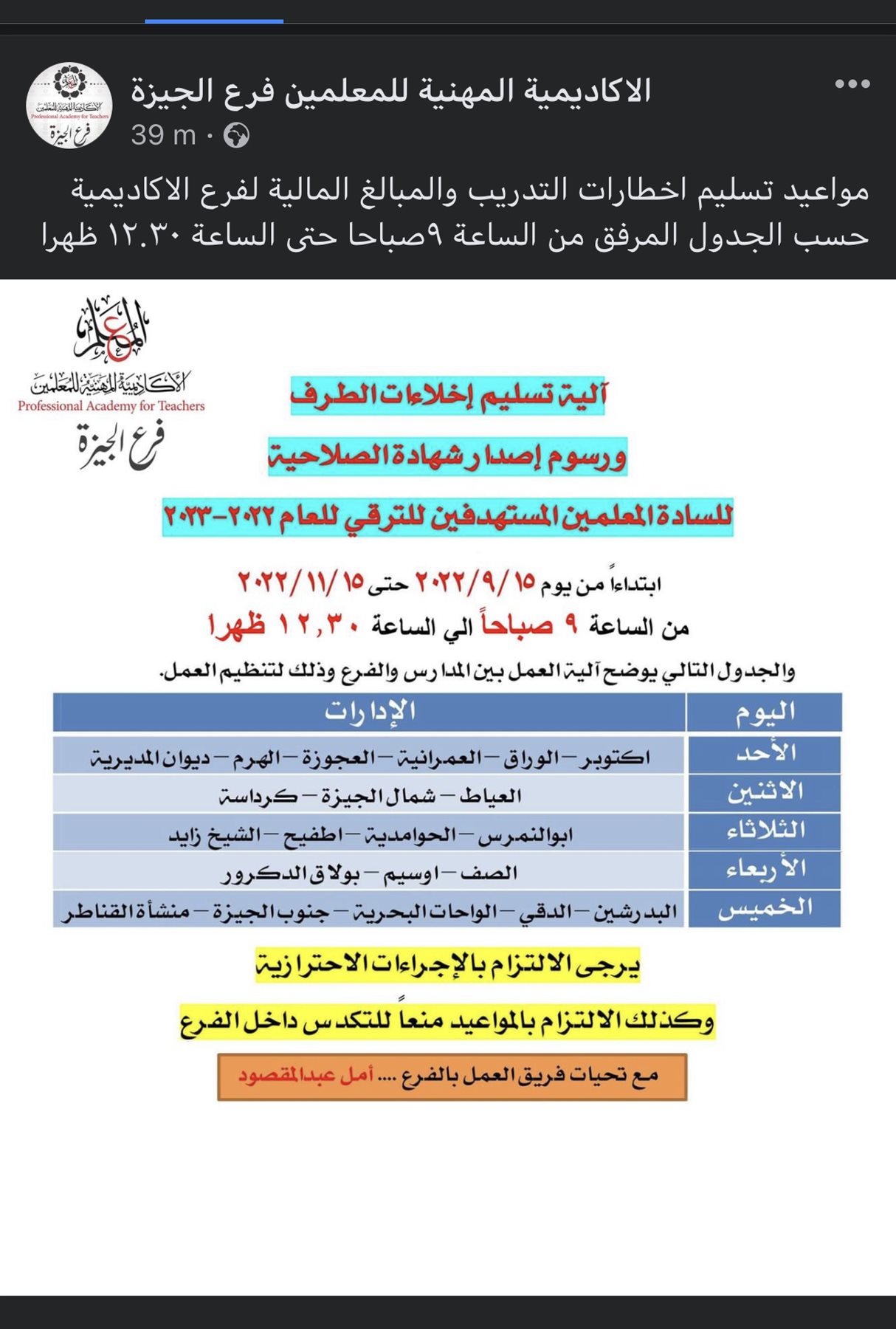 طالبت الأكاديمية المهنية للمعلمين، أعضائها عبر صفحتها على موقع التواصل الاجتماعي فيس بوك، بالالتزام بمواعيد تسليم إخطارات تدريبات الترقي حسب الجدول المعلن من الأكاديمية لكل إدارة تعليمية منعا للتكدس.