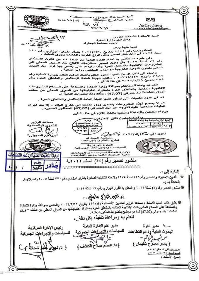 ونص منشور تصدير رقم (25) لسنة 2022 بتطبيق كتاب مساعد الوزير للشئون الاقتصادية رقم 4267 بتاريخ 2022/9/12 والخاص بموافقة وزارة التجارة والصناعة علي السماح للمشروعات الإنتاجية المقامة بالمناطق الحرة باستيراد احتياجاتها من السوق المحلي من صنف " ورق الدشت " بند جمركي (47.07) وذلك وفقا للضوابط التالية: -