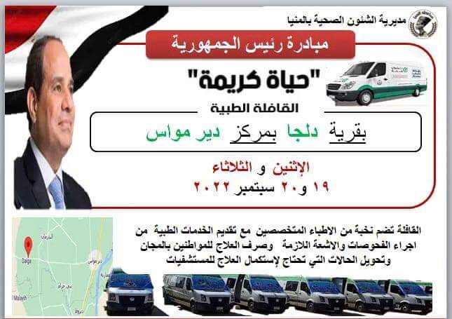 تنظم مديرية الصحة في المنيا، بدءا من غدا الاثنين، قافلة طبية علاجية في قرية دلجا التابعة أداريا لمركز ومدينة دير مواس، جنوب المحافظة، على مدار يومين متتاليين19 و20 من سبتمبر الجاري، وذلك في إطار الاهتمام بمواطني المحافظة، وتقديم الخدمات الطبية وصرف العلاج لهم بالمجان.