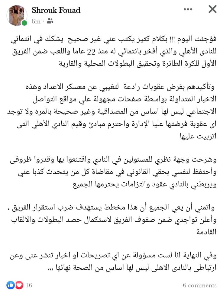 وقالت شروق فؤاد عبر فيسبوك: فوجئت اليوم بكلام كثير يكتب عني غير صحيح يشكك في انتمائي للنادي الأهلي والذي أفخر بانتمائي له منذ 22 عاما واللعب ضمن الفريق الأول للكرة الطائرة وتحقيق البطولات المحلية والقارية.