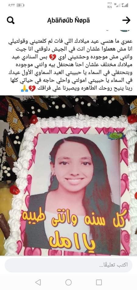 حاول شقيقها أن يتمالك أعصابه وأكمل منشوره وهو يؤكد أن عيد ميلادها في هذا العام مختلف عن الأعياد السابقة، قائلا: بس السنة دي عيد ميلادك مختلف، علشان احنا هنحتفل بيه وانتي موجوده، وبتحتفلي في السماء، يا حبيبتي العيد السماوي الأول عيدك في السماء يا حبيبتي، امولتي وأحلي حاجه في حياتي كلها، ربنا ينيح روحك الطاهره ويصبرنا على فراقك.