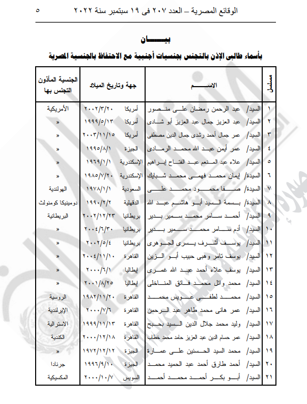 نشرت جريدة الوقائع المصرية في العدد الصادر برقم 207 في 19 سبتمبر لسنة 2020، قرار وزارة الداخلية، الذي حمل رقم 1793 لسنة 2020، الصادر من اللواء محمود توفيق وزير الداخلية، بالإذن لـ 21 مواطنا بالتجنس بالجنسية الأجنبية، مع احتفاظهم بالجنسية المصرية.