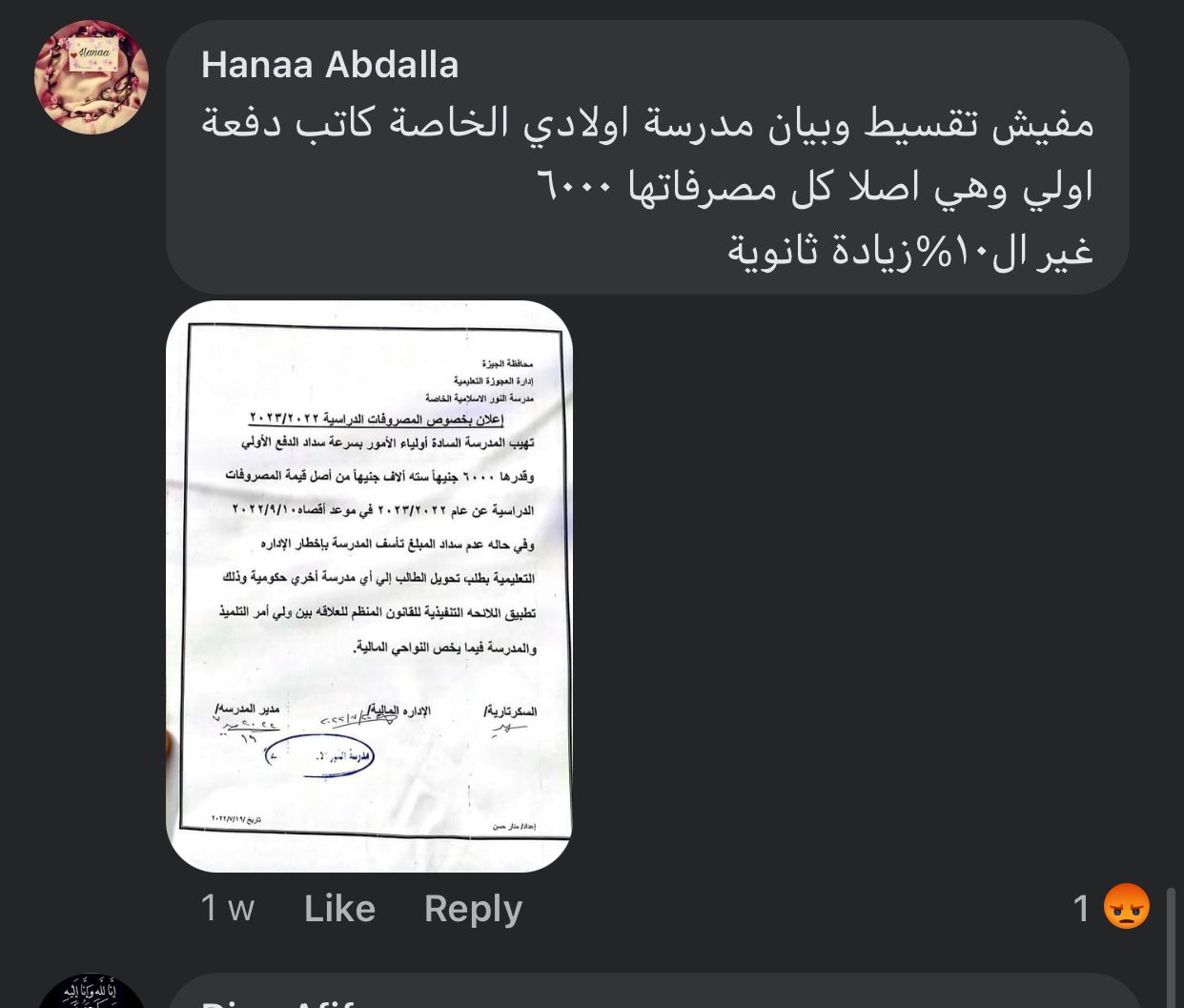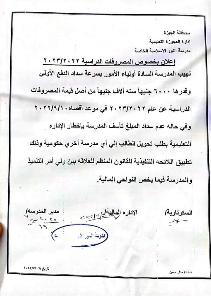 وكتبت سارة السيد، ولية أمر، إن مدرسة المنارة التربية الإسلامية في عين شمس تصل قيمة المصروفات بها لـ 11600 جنيه، يتم دفع قسط أول 8100، والثاني 3500 ويرفضون السداد على 4 أقساط، قائلين إنهم لم يصلهم أي قرار بهذا الشأن.