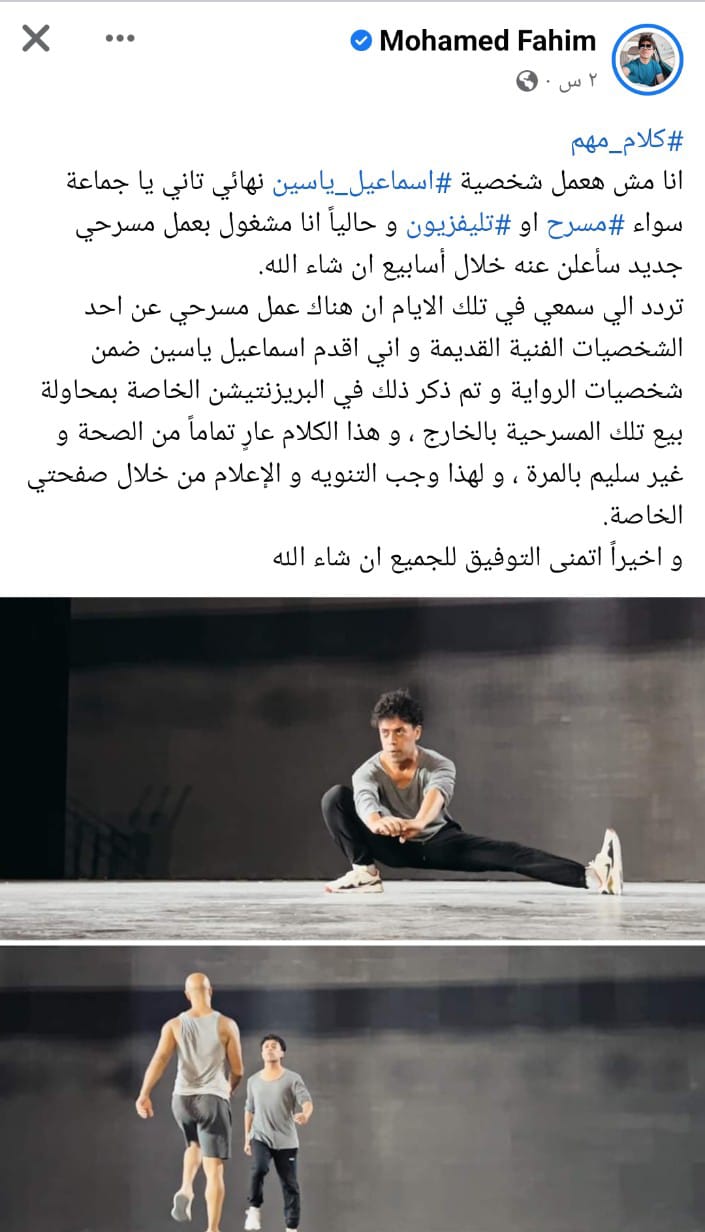 وتابع محمد فهيم: تردد إلى سمعي في تلك الأيام أن هناك عمل مسرحي، عن أحد الشخصيات الفنية القديمة، وأني أقدم إسماعيل ياسين، ضمن شخصيات الرواية، وتم ذكر ذلك في البريزنتيشن الخاصة، بمحاولة بيع تلك المسرحية بالخارج، وهذا الكلام عارٍ تمامًا من الصحة وغير سليم بالمرة، ولهذا وجب التنويه والإعلام من خلال صفحتي الخاصة.. وأخيرًا أتمنى التوفيق للجميع إن شاء الله.