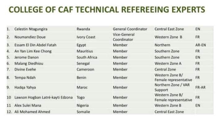 واستمر سيلستين نتاجونجيرا من رواندا، رئيسًا لـ لجنة حكام كاف، فيما جاء نوماندييه دويه من كوت ديفوار، نائبًا له، وضمت القائمة كل من: