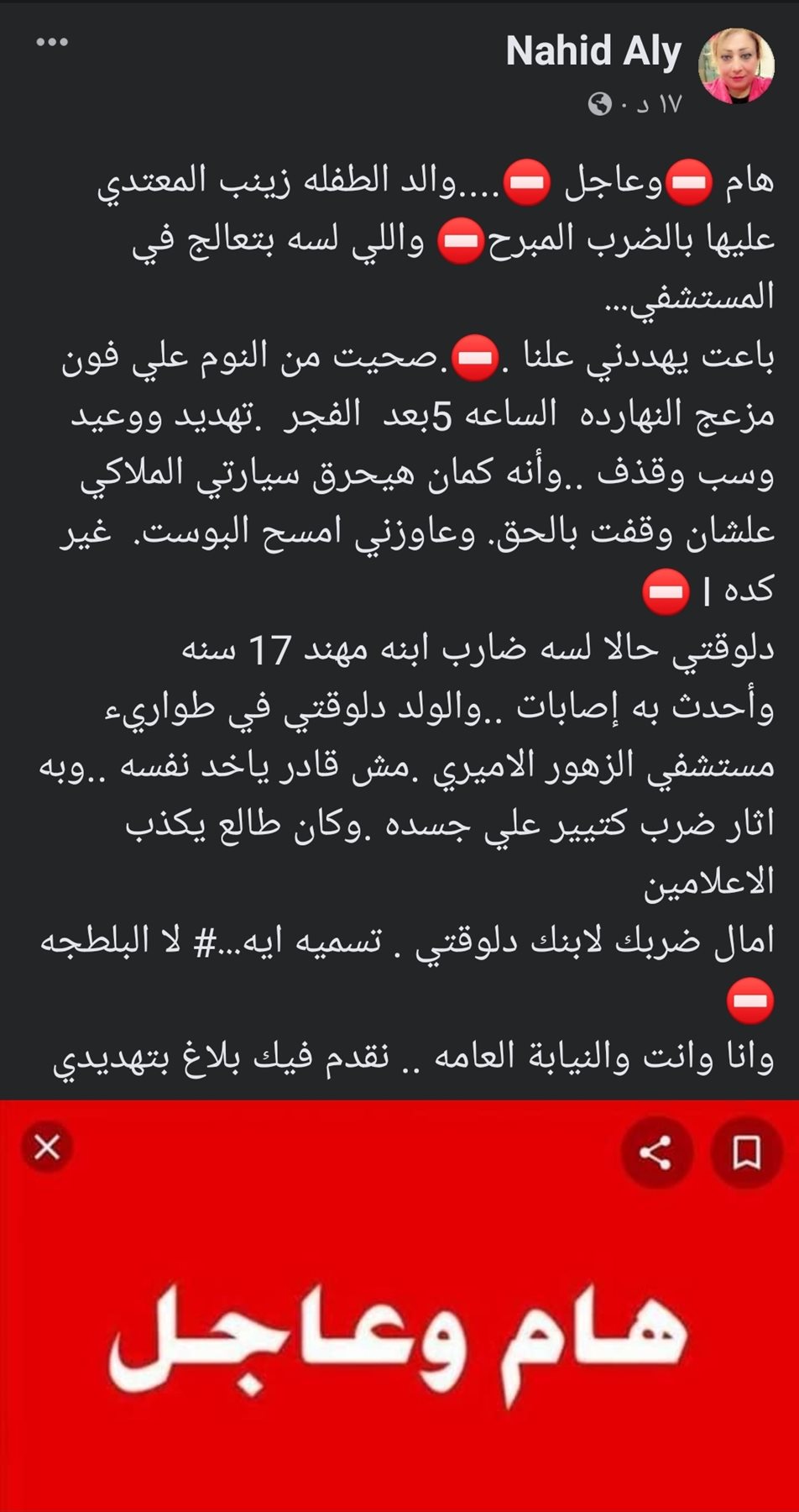 وكشفت ناهد عبد الرازق في منشور لها عبر صفحتها الرسمية على فيس بوك، أن والد الطفلة زينب مجدي المعتدي عليها بالضرب المبرح، والتي لا تزال تحصل على العلاج في مستشفى السلام الدولي التابع لمنظومة التأمين الصحي الشامل وهيئة الرعاية الصحية، هددها في مكالمة هاتفية.