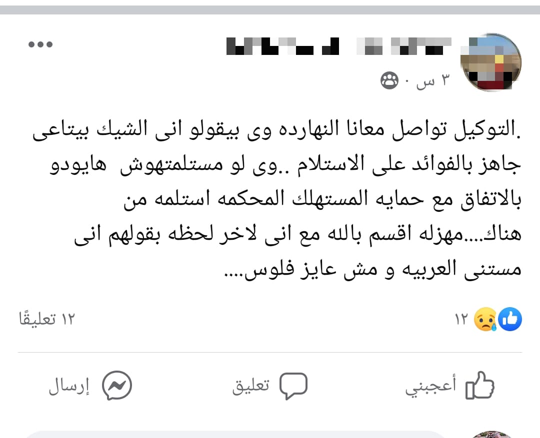 بينما قال محمود غندور، أحد الحاجزين على حسابه الشخصي: التوكيل تواصل معايا النهاردة وبيقولوا إن الشيك بتاعي جاهز بالفوائد على الاستلام ولو مستلمتهوش هيبعته بالاتفاق مع حماية المستهلك، إلى المحكمة استلمه من هناك.