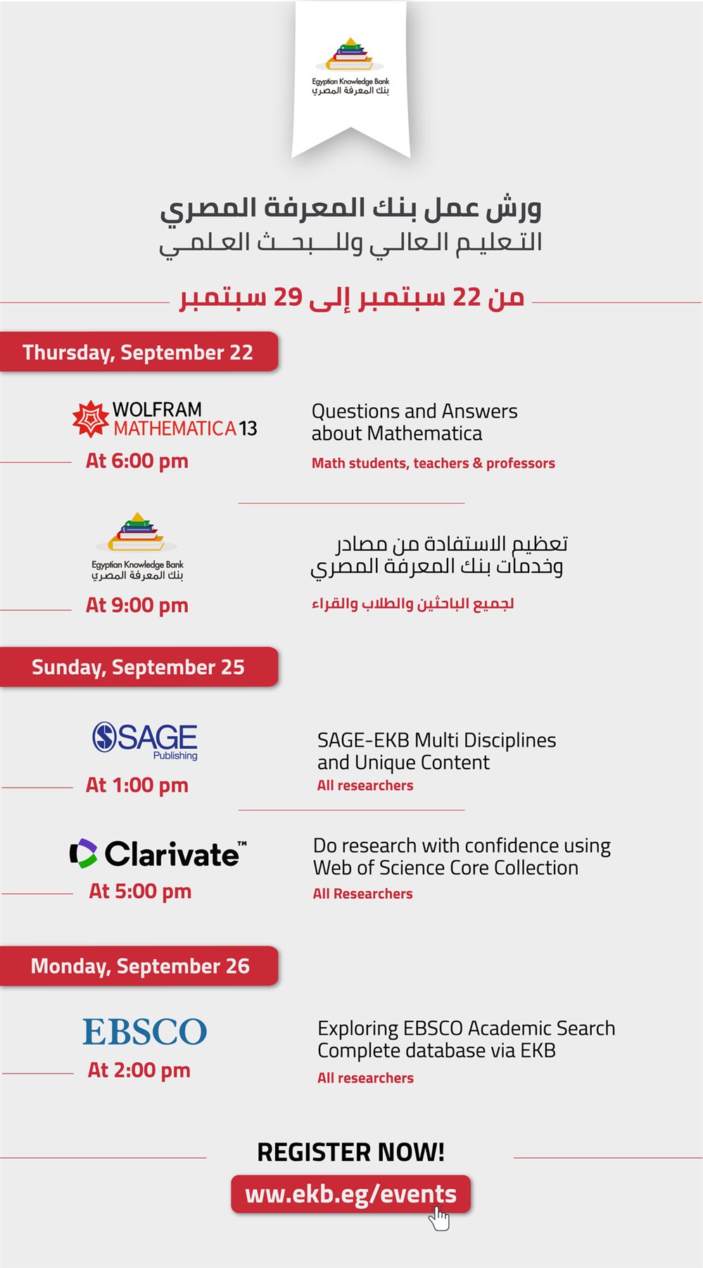 ينظم بنك المعرفة المصري، عدة ورش مجانية عبر الإنترنت في الفترة من 22 سبتمبر إلى 29 سبتمبر للطلاب الجامعيين والباحثين وأعضاء هيئة التدريس.