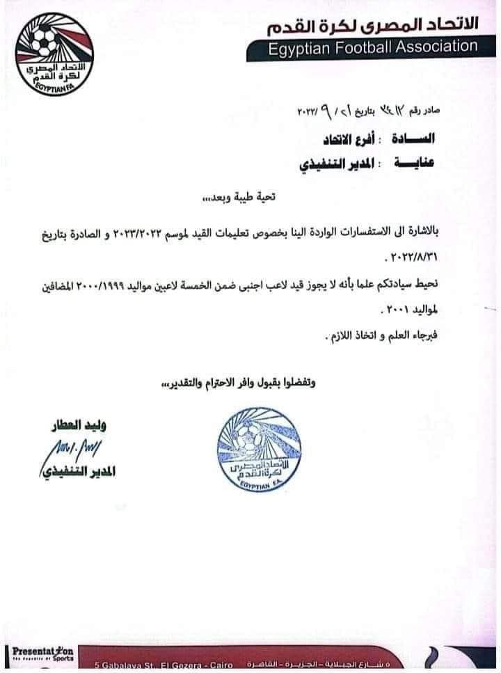 وأرسل اتحاد الكرة اليوم خطابًا إلى أفرعه بمختلف محافظات الجمهورية وتضمن الخطاب تأكيدًا على عدم السماح بقيد أي لاعب أجنبي ضمن الخماسي مواليد 1999/2000، الذين سيتم السماح بإضافتهم إلى فريق مواليد 2001 بكل ناد.