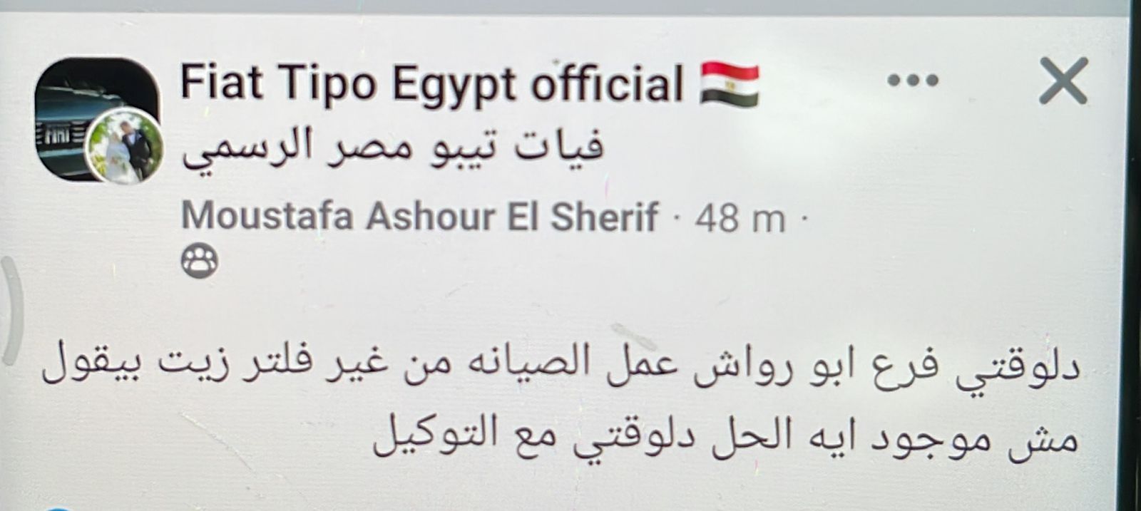وكتب: دلوقتي فرع الوكيل عمل صيانة العربية من غير فلتر زيت وبيقول مش موجود، إيه الحل دلوقتي مع التوكيل!؟.