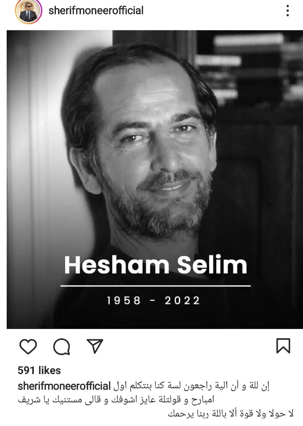 وشارك شريف منير، متابعيه صورا، لـ هشام سليم، عبر حسابه الشخصي بموقع انستجرام، وعلق عليها قائلا: إن لله وإن إليه راجعون، لسه كنا بنتكلم أول أمبارح وقولتله عايز أشوفك، قالي مستنيك يا شريف، لا حول ولا قوة إلا بالله ربنا يرحمك.