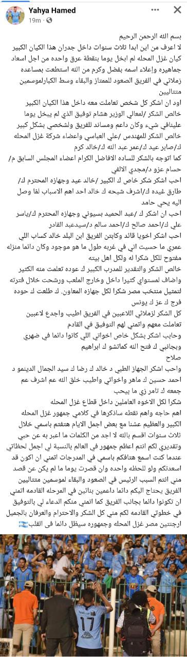 وتابع يحيى حامد في منشوره أود أن أشكر كل شخص تعاملت معه داخل هذا الكيان الكبير، خالص الشكر لمعالي الوزير هشام توفيق الذي لم يبخل يوما علينا في شيء وكان داعم ومساند للفريق ولشخصي بشكلٍ كبير، خالص الشكر للمهندس علي العباسي وأعضاء شركة غزل المحلة صابر عيد عمر عبد الله خالد كرم.