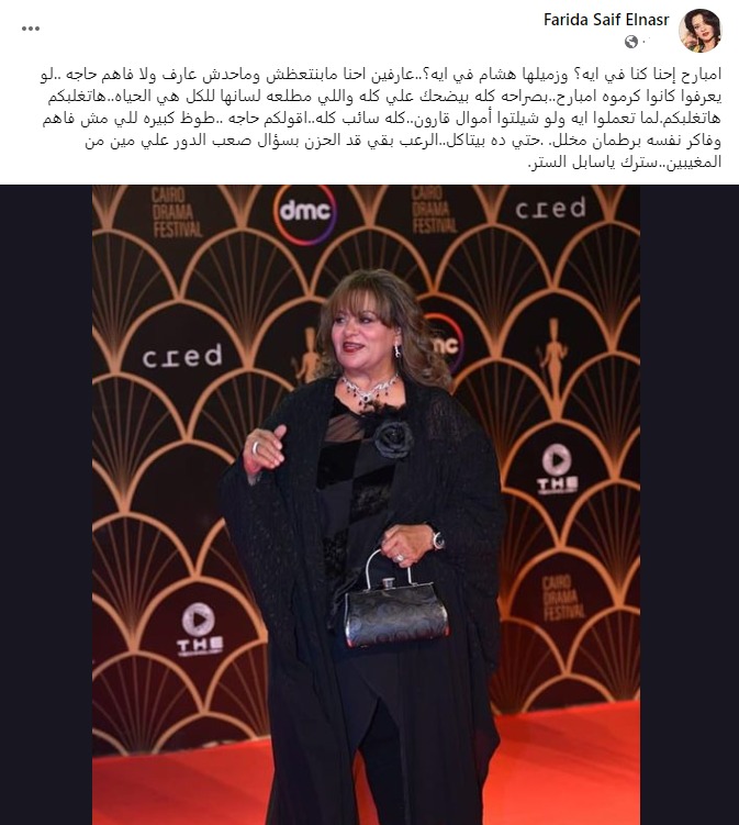 وأضافت فريدة سيف النصر: بصراحة كله بيضحك على كله واللي مطلعة لسانها للكل هي الحياة، هتغلبكم هتغلبكم، لما تعملوا إيه ولو شيلتوا أموال قارون، كله سائب كله، اقولكم حاجه: طظ كبيرة للي مش فاهم وفاكر نفسه برطمان مخلل حتى ده بيتاكل، الرعب بقي قد الحزن، سؤال صعب الدور على مين من المغيبين سترك يا سابل الستر.