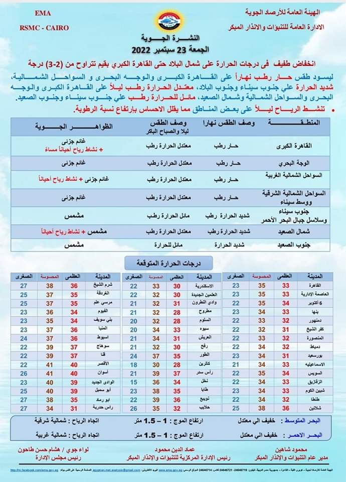 كشفت الهيئة العامة للأرصاد الجوية، تفاصيل حالة الطقس، التي تشهدها المدن المصرية، وكذلك درجات الحرارة، لذا يقدم القاهرة 24 موجز أخبار الطقس، غدًا الجمعة الموافق 23 سبتمبر عام 2022.