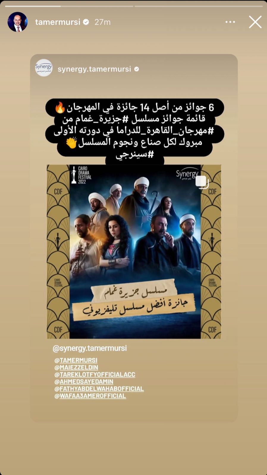 ونشر تامر مرسي، صور بوسترات العمل وصناعه المكرمين، عبر خاصية ستورى على حسابه الشخصي بموقع انستجرام، وعلق قائلًا: 6 جوائز من أصل 14 جائزة في المهرجان قائمة مسلسل جزيرة غمام من مهرجان القاهرة للدرما في دورته الأولى.. مبروك لكل صناع ونحوم المسلسل.