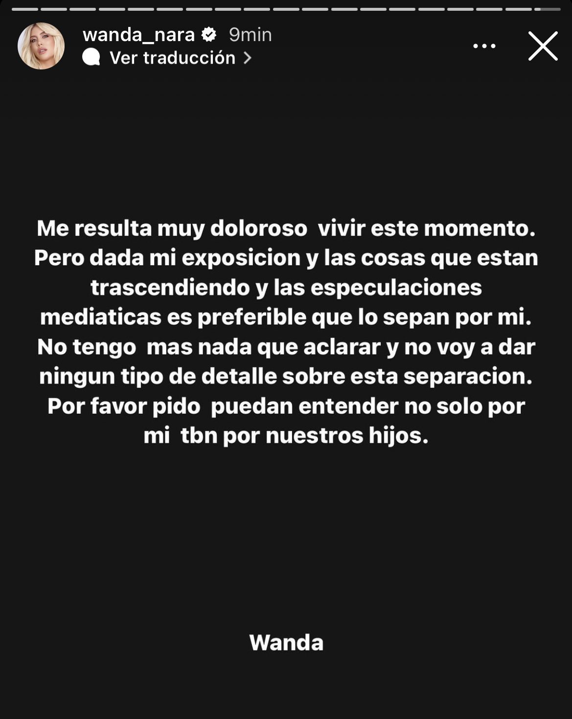 ونشرت واندا نارا عبر حسابه الرسمي على انستجرام أمس الخميس 22-9-2022: "إنها لحظة مؤلمة للغاية، لكن بالنظر إلى تكهنات وسائل الإعلام المنتشرة مؤخرًا فمن الأفضل سماعها مني".