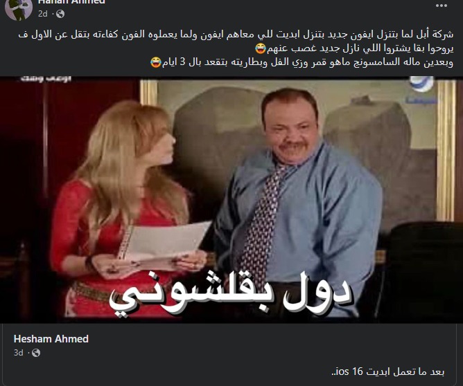 وسخر منشور ذاكرًا: شركة أبل لما بتنزل آيفون جديد بتنزل أبديت للي معاهم آيفون ولما يعملوه التليفون كفاءته بتقل عن الأول فيروحوا بقا يشتروا اللي نازل جديد غصب عنهم.