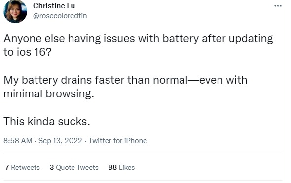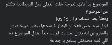 طرحت ديلي ميل البريطانية، مشكلة تواجه مستخدمي iPhone، ومن قاموا بتحديث أجهزتهم، لإصدار iOS 16، حيث اشتكى العديد من مشاكل في البطارية، بعد القيام بالتحديث، معلقين: لا تقم بالتحديث إلى iOS 16، إلا إذا كنت تريد أن تنتقل بطاريتك، من 100 إلى 90 في 30 دقيقة.