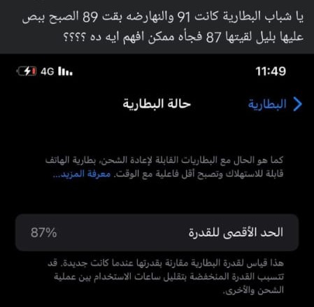 وأضاف الباحث أن على المستخدم الانتظار بضعة أيام بعد تنزيل التحديث، وفي حال استمرار المشكلة ذاتها، نصح بفحص بطارية الهاتف، عن طريق الانتقال إلى الإعدادات، ثم البطارية، وصحة البطارية، وإذا كانت البطارية جيدة بالنسبة للحد الأقصى للقدرة، فإنها مشكلة ستحلها أبل لاحقًا.